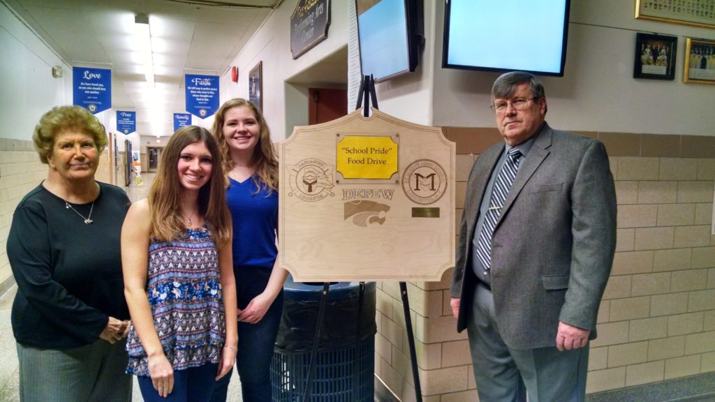 Picture Caption: (From left to right) Depew Village Trustee member Audrey Hamernik, St. Mary’s National Honor Society President Chelsea Okon ʼ18, National Honor Society member Stephanie Baran ʼ18, and Depew Village Mayor Jesse Nikonowicz pose with the plaque gifted to St. Mary’s for winning the “School Pride” Food Drive outside of the St. Mary’s school dance this past weekend.