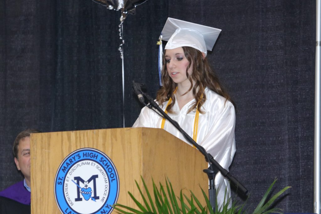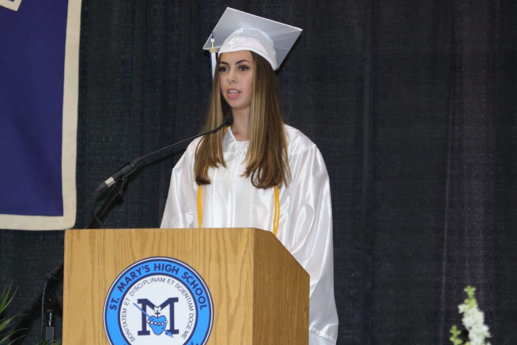 Dean of Academics & Curriculum, Mr. Junik led the ceremony, introducing Mr. Fay to give the Invocation. Class President, Shae Antonicelli, then gave an inspiring address, relating students’ time at St. Mary’s to the process of putting together a puzzle. Each year, the end picture starts to get clearer thanks to the help of the St. Mary’s faculty and the friends met along the way. Valedictorian, Chelsea Okon also addressed the nearly 900-person crowd with a speech that focused on how the millennial generation, while considered underdogs, has the power to change the world.