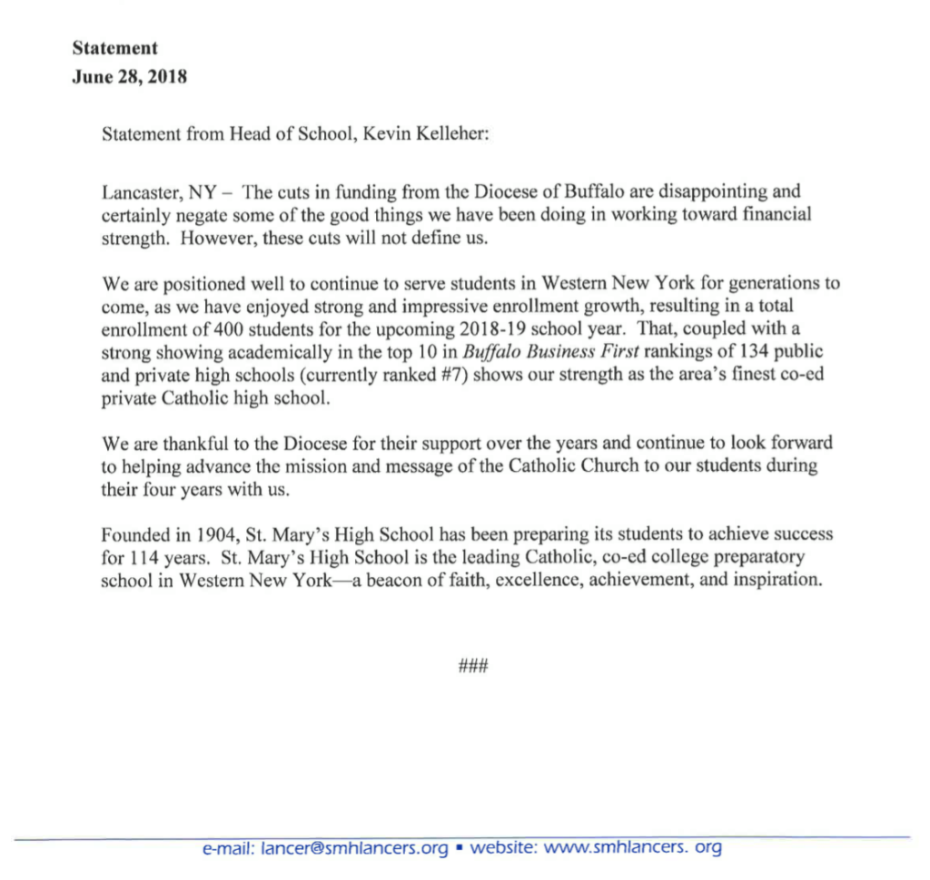 St. Mary’s has released an official statement on the news regarding the Diocesan funding cuts. Have no fear! St. Mary’s is here to stay for generations of Lancers to come. Take it away, Mr. Kelleher: