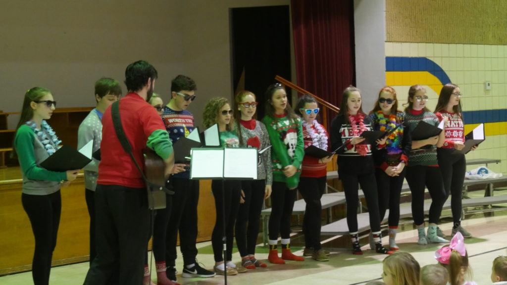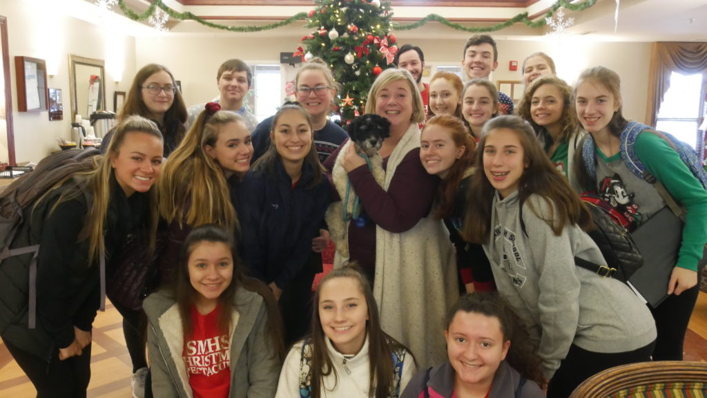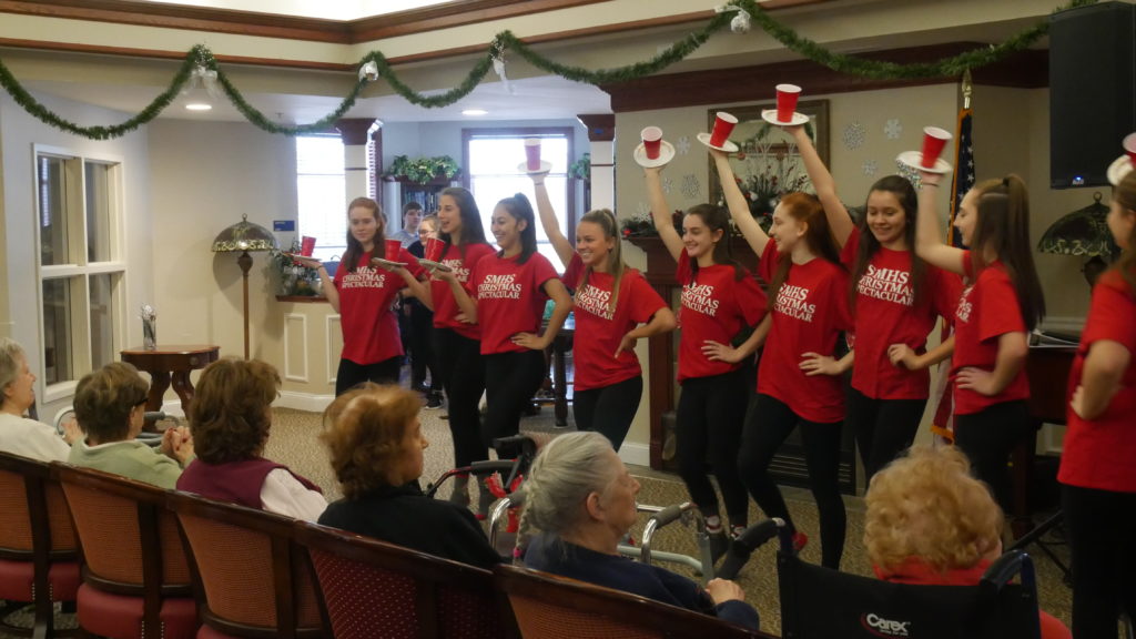 St. Mary’s took their Christmas Show on tour once again this year, singing and dancing for local grammar schools and assisted living facilities to spread the joy of the season. The Glee Club, Handbell Choir, Tap Club, Ballet Club, kickline, and solo artists all showed their best stuff on the tour. Stops included Our Lady of the Blessed Sacrament School (OLBS), Notre Dame Academy, Immaculate Conception, Tennyson Court, and The Greenfields.
