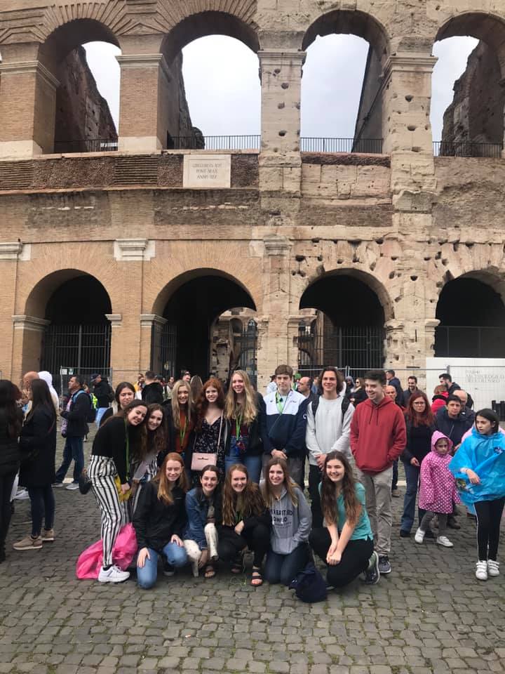 There were also some very cool Lancer legacies along for this trip! Head of School Mr. Kelleher ’89 is pictured with his mom and fellow Lancer alum, JoAnn Kelleher ’63 (right), and longtime Social Studies teacher Mrs. Connelly ’71 and Dean of Student life & Enrollment Mrs. Drabik can be found enjoying some pizza on the streets of Italy with them as well (left)!