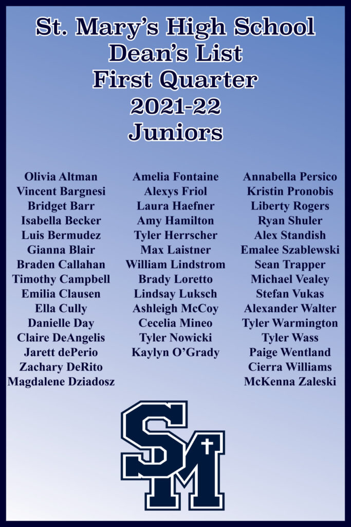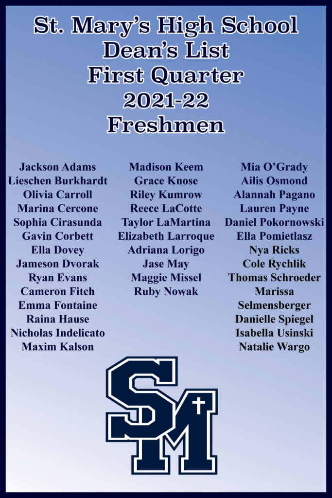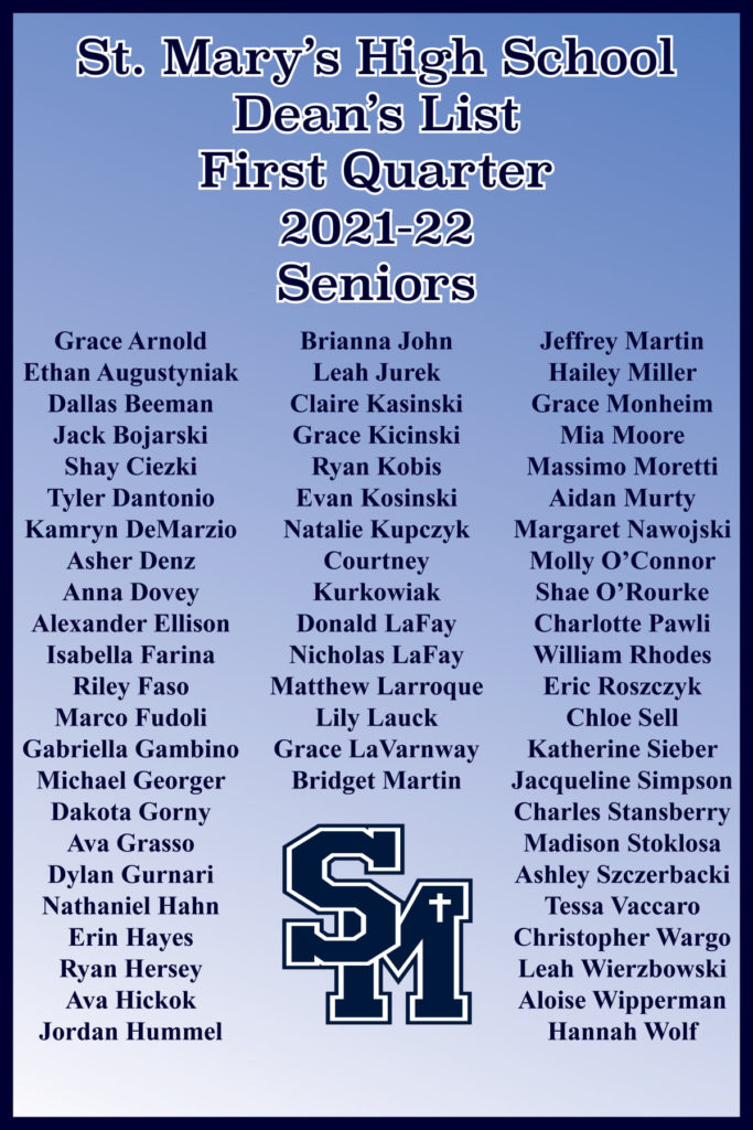 St. Mary’s Announces First Quarter Dean’s List Posted November 16, 2021 by Amy Kawa & filed under Uncategorized. The following students were named to the Dean’s List for the first quarter of the 2021-22 school year: