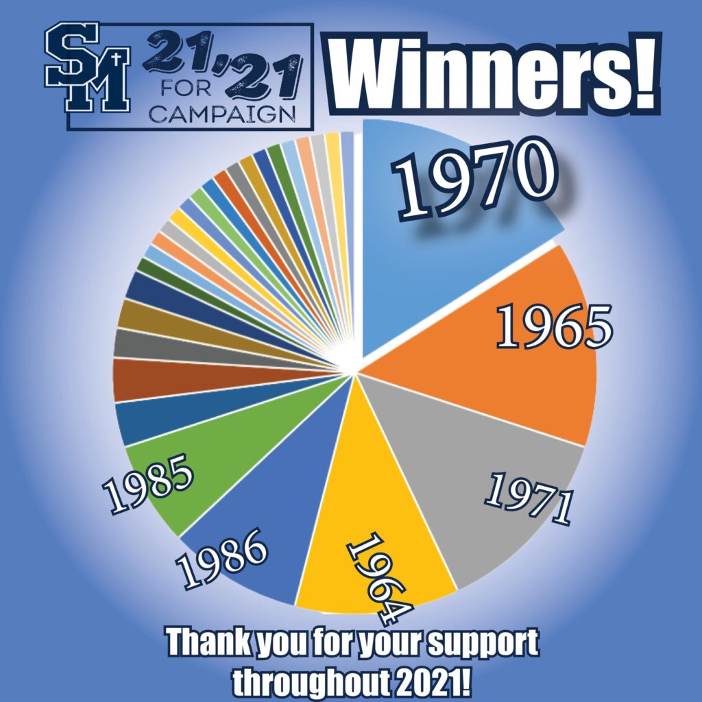 As we look back on 2021, we have discovered the winning class of our 21 for ’21 Campaign. Congratulations to the Class of of 1970 who accounted for 16% of the total donations last year! The Classes of 1965, 1971, and 1964 were all in the running as well.