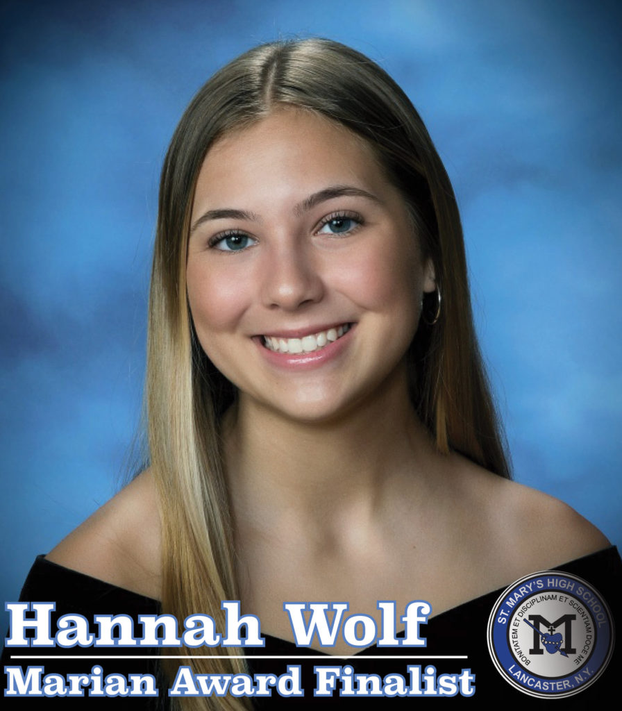 – Hannah Wolf has a GPA in the top 10% of her class and is also a National Honor Society member. She always has a smile on her face, and her classmates see her as very inclusive towards everyone. Hannah has participated in volleyball and cheer throughout her time at St. Mary’s and will be attending Daemen University to study childhood education.