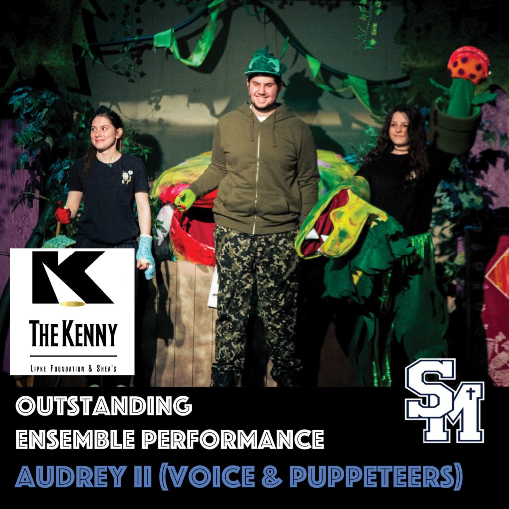 The Kenny Awards, which honor the best of the best in WNY high school theater, were held Saturday, May 21st at Shea’s Performing Arts Center. Not only did the cast of St. Mary’s production of Little Shop of Horrors partake in Kenny Day, inclusive of workshops and performing on the Shea’s stage, but St. Mary’s also grabbed five nominations!
