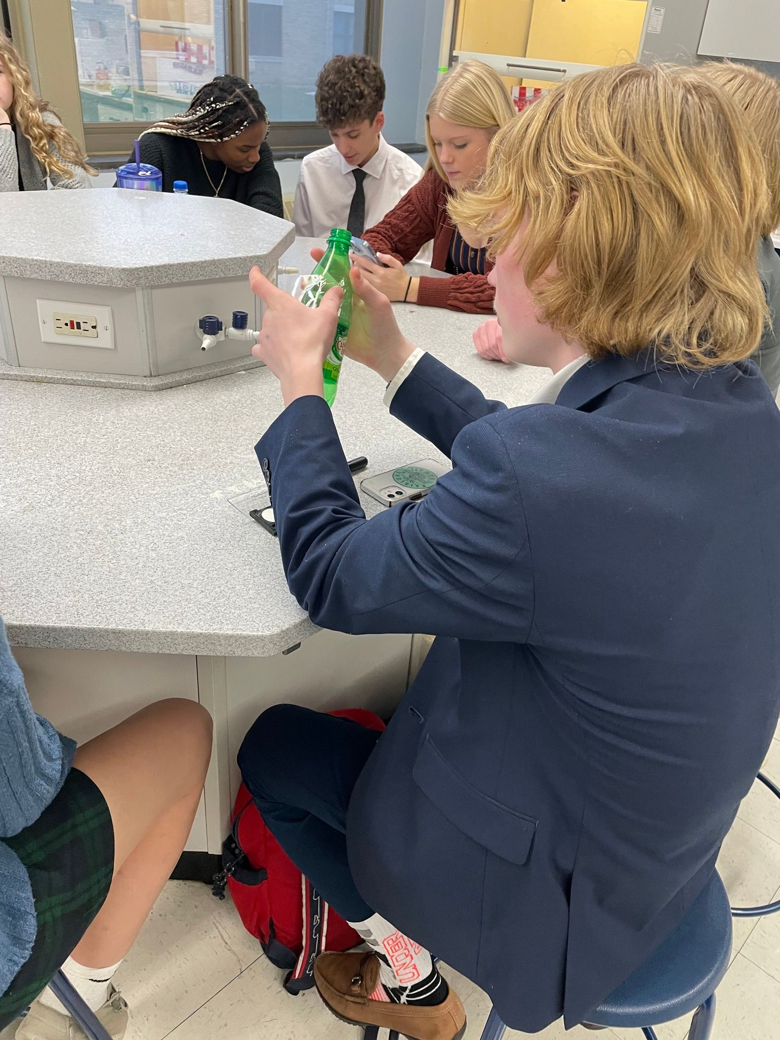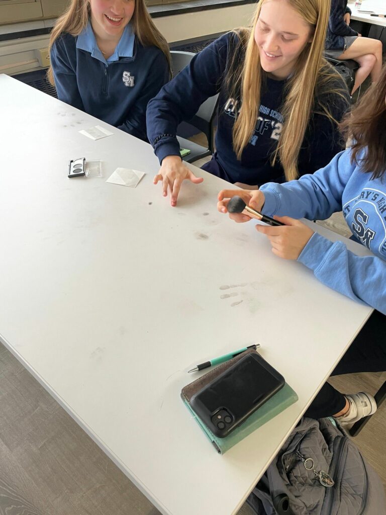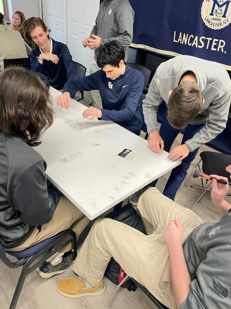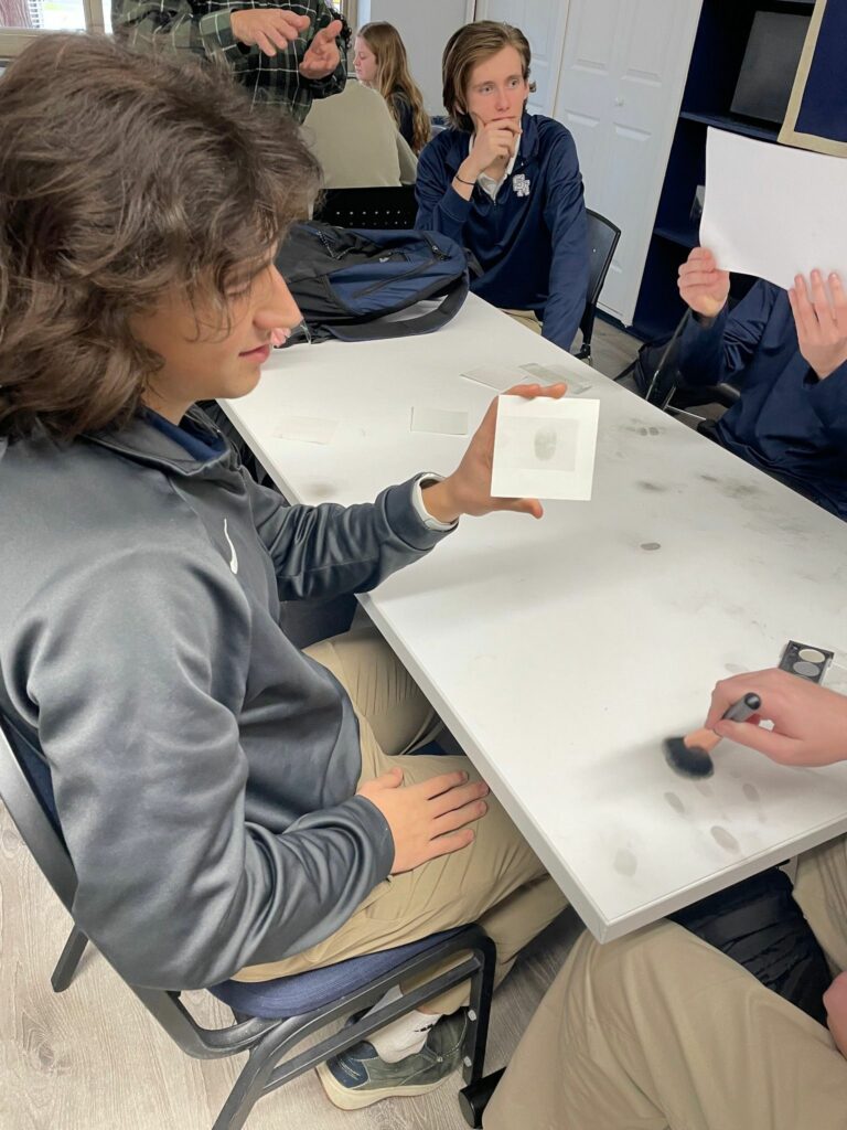 With our students, he discussed the different types of fingerprints and what causes them to be left behind, showed them how to dust for fingerprints and lift them, and then worked in the lab with chemically processed fingerprints taken off of pop bottles and cans. So cool!