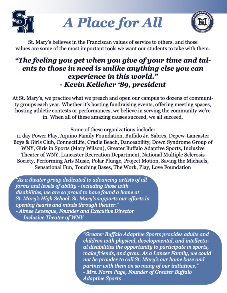 St. Mary’s High School is the prominent Catholic co-ed preparatory school in Western New York; a beacon of faith, excellence, achievement, and inspiration for our students and families as well as other organizations throughout the community.
